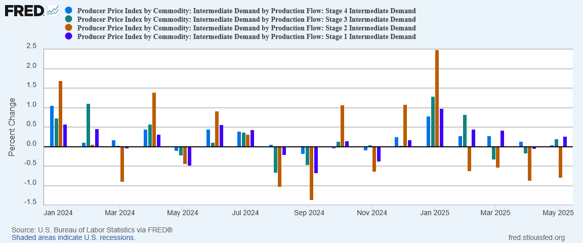 Intermediate Demand PPI is not charting a significant inflation uptick in any of the four stages.