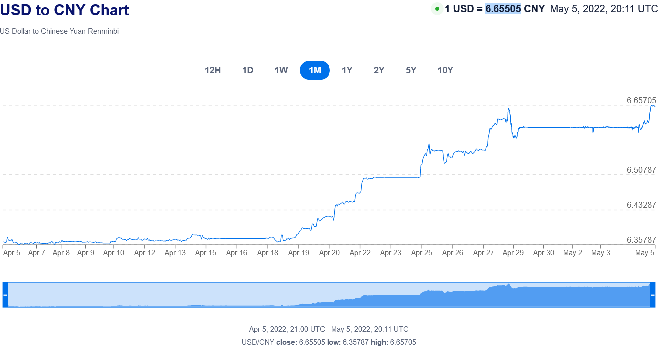 Even though the ruble had already been recovering from its post-invasion low against the dollar, the establishment of the Central Bank of Russia’s “gold peg” certainly appears to have helped strengthen the ruble against the dollar. Intriguingly, the ruble has also strengthened against China’s yuan, and by a greater percentage than against the dollar. As a result, the dollar has actually strengthened against the yuan.