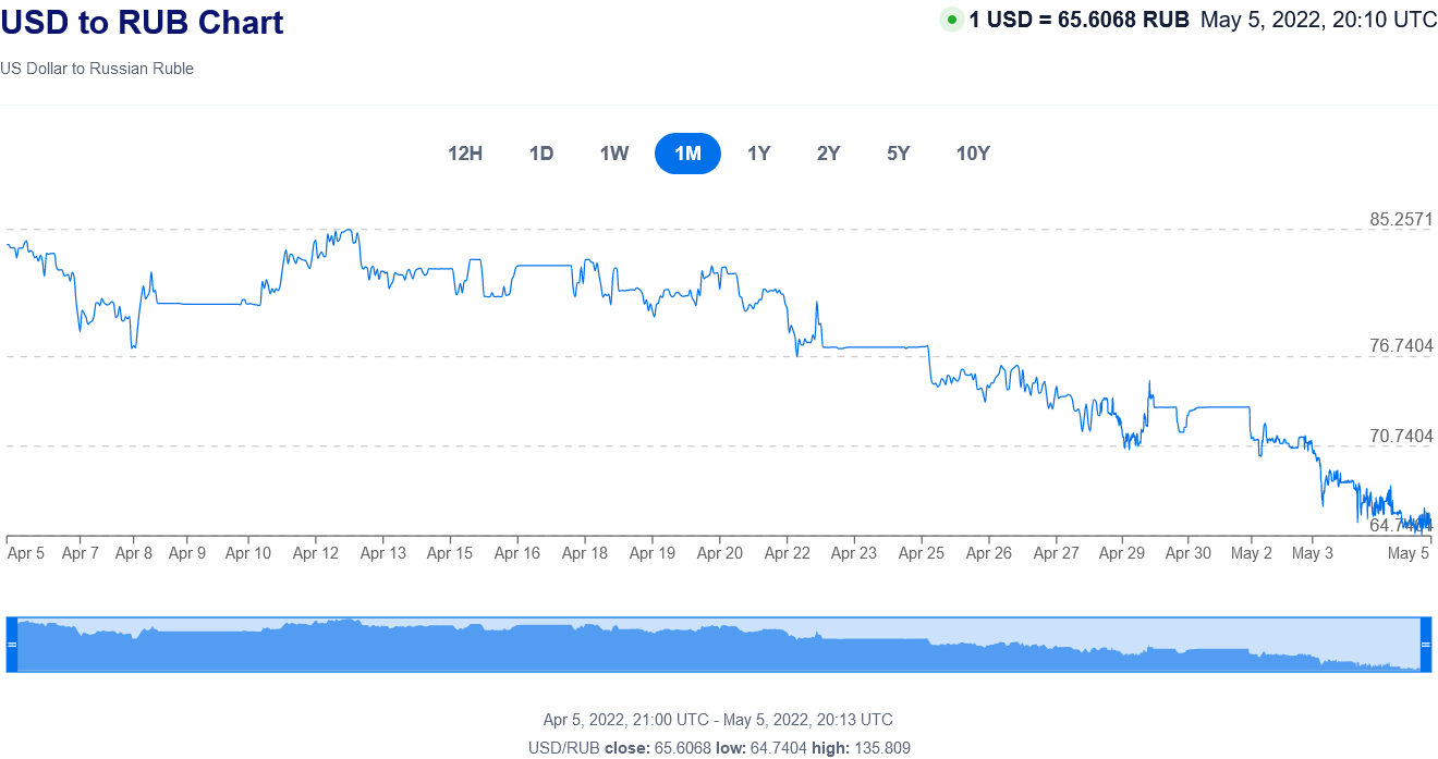 In the past month, the US Dollar has declined significantly against the ruble, dropping over 22% since April 5.