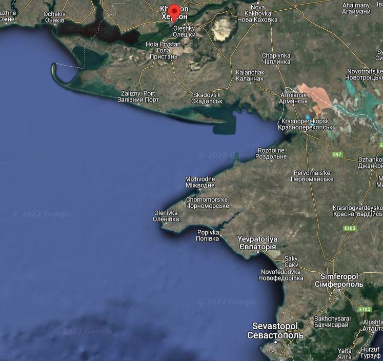 Note that the major roads in the area are all well within the range of Ukrainian artillery and HIMARS missile batteries. If Russia wants to defend the peninsula it has to place troops under Ukrainian artillery fire to do so.