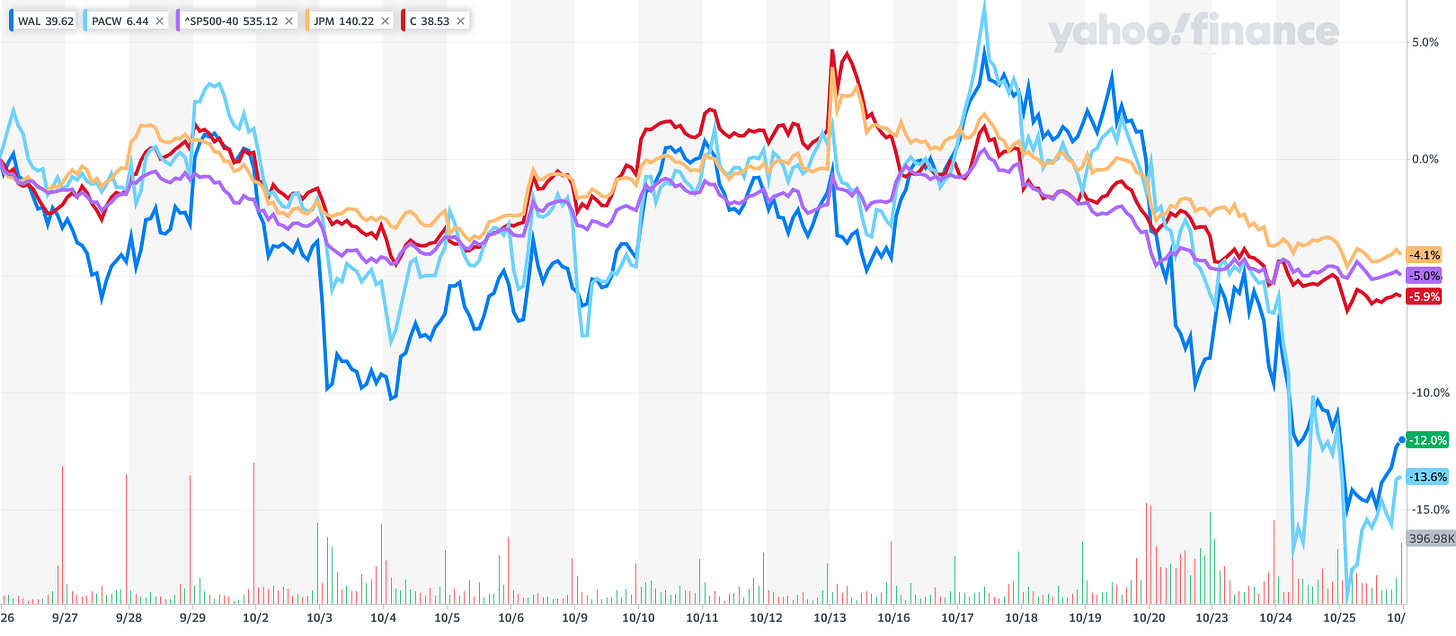 Larger banks, however, have been buying in recent weeks. Curiously, Wall Street is not punishing large banks for their apparently bad investment choices, as JP Morgan and Citi have fared better in the market than Western Alliance and PacWest—two smaller banks who have been viewed as potential next banking dominoes to fall.