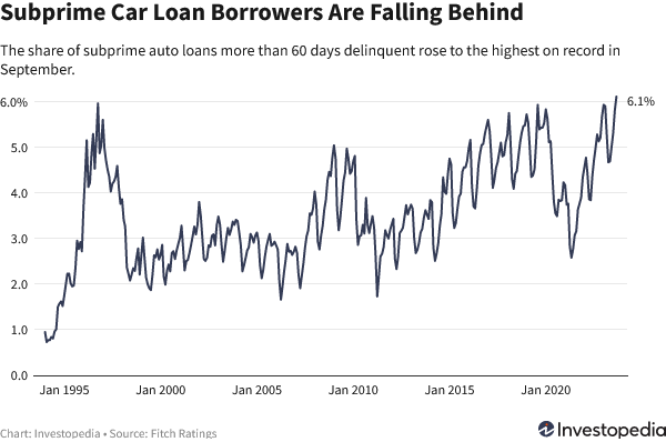 As of September, 6.1% of U.S. subprime borrowers—those with the lowest credit scores—were 60 days or more behind on their car payments, up from 5.87% in August and the highest share in data from Fitch Ratings that go back to 1994, as the chart below shows.