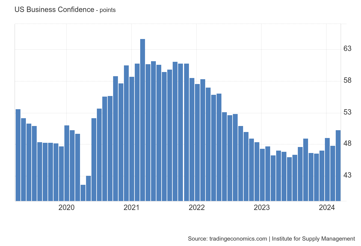 In data released on Monday, a barometer of business conditions at U.S. manufacturers turned positive in March for the first time in 17 months, a sign that the industrial side of the economy is on the mend. The ISM’s data also showed that the prices-paid component, a measure of inflation, rose 3.3 points to 55.8%.