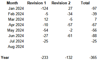 The change in total nonfarm payroll employment for June was revised down by 61,000, from +179,000 to +118,000, and the change for July was revised down by 25,000, from +114,000 to+89,000. With these revisions, employment in June and July combined is 86,000 lower than previously reported. (Monthly revisions result from additional reports received from businesses and government agencies since the last published estimates and from the recalculation of seasonal factors.)