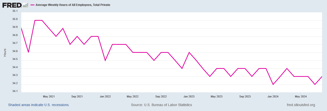What the declining work hours doesn’t take away from the paycheck, inflation still has, as a comparison of the nominal average weeky earnings to the CPI-adjusted real average weekly earnings illustrates1.