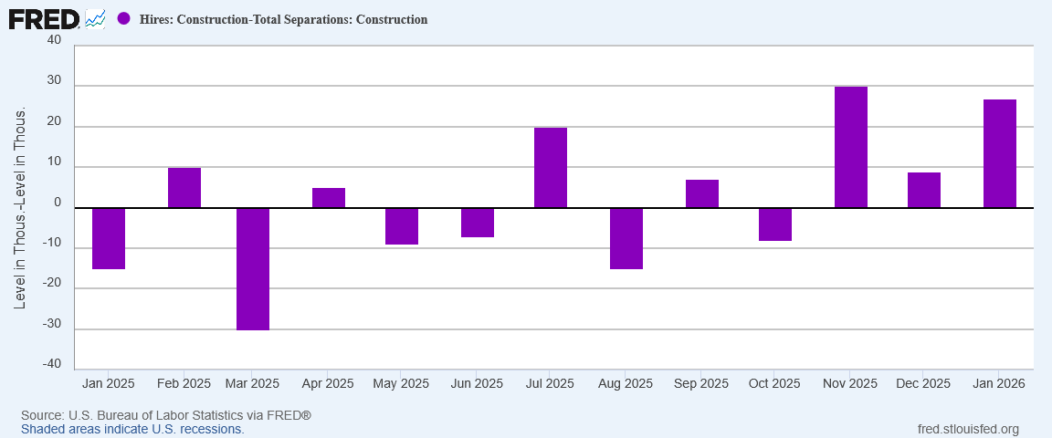 Construction, which languished for most of 2025, printed its third consecutive month of positive net hiring.