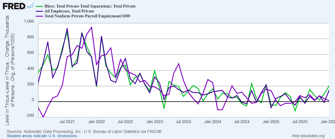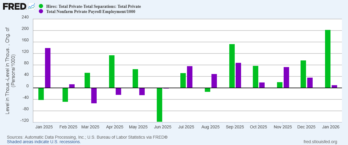 Where the JOLTS and the BLS jobs report concur is that January saw an increase in new jobs, while the ADP report showed new jobs shrinking even further in January.