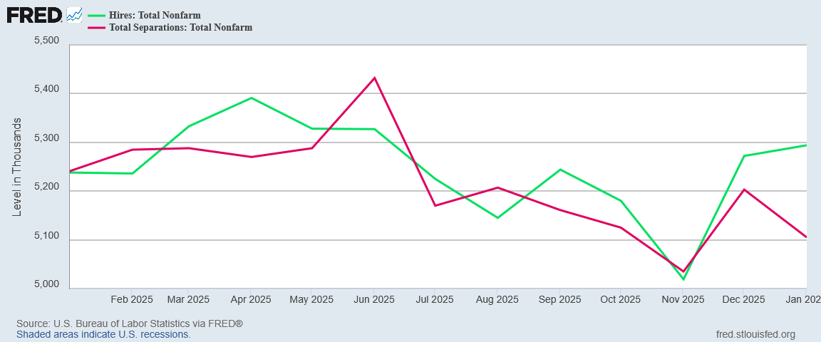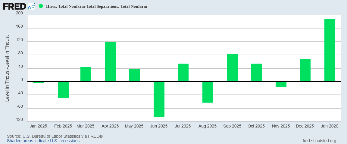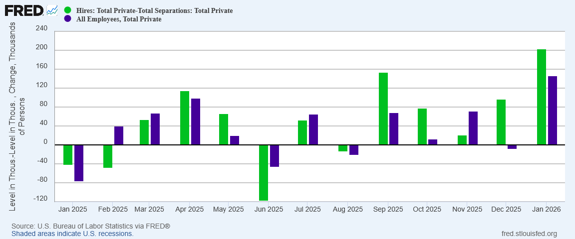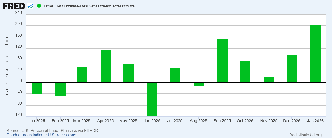 While the net hiring growth came largely from a decline in separations, the end result still points to an overall increase in the number of people on a payroll somewhere in the US. Net hiring is actual job growth in every scenario.