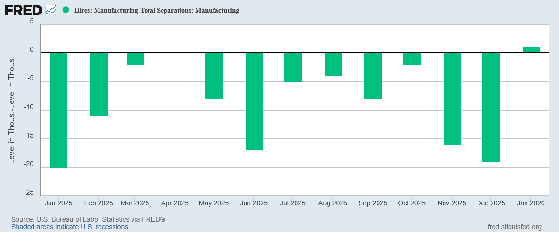 Net hiring in manufacturing was positive for January, although just barely. As with the jobs report, Manufacturing has been losing jobs steadily for over a year, and the January uptick barely stops that bleeding.
