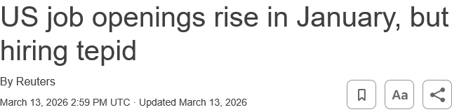 Job openings, a measure of labor demand, rose by 396,000 to 6.946 million by the last day of January, the Labor Department’s Bureau of Labor Statistics said in its Job Openings and Labor Turnover Survey, or JOLTS report, on Friday. Economists polled by Reuters had forecast 6.70 million unfilled jobs. The job openings rate increased to 4.2% from 4.0% in December.