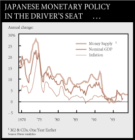 The Bank of Japan reacted belatedly in 1990, reducing monetary growth from 13 percent to less than 3 percent in the first year of the new policy and to negative rates in the second--too much of a good thing. Tight money was spectacularly effective; the stock market, and also nominal income growth, plunged. Low inflation turned into actual deflation by 1994. Monetary growth has recovered since but remains at the lowest level of the postwar period.