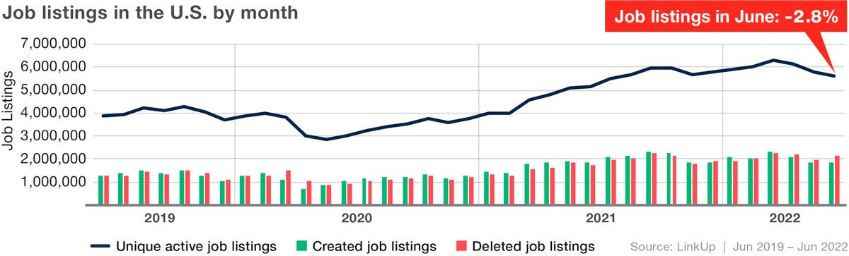 Job listings in the U.S. were down 2.8% in June, with 94% of states seeing jobs drop. The states with the highest rates of decline include South Dakota (-10.1%), Maryland (-7.9%), and Missouri (-5.7%). The only states seeing job listings grow: Hawaii (+4.1%) and Alaska (+1.9%).