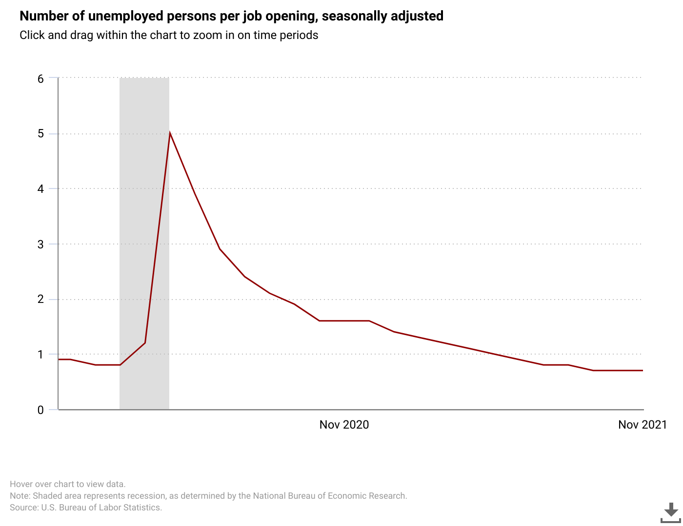 Despite job openings decreasing by over 500,000 to 10.6 million, there are still 3.7 million more jobs than unemployed people, result of unemployment shrinking as well.
