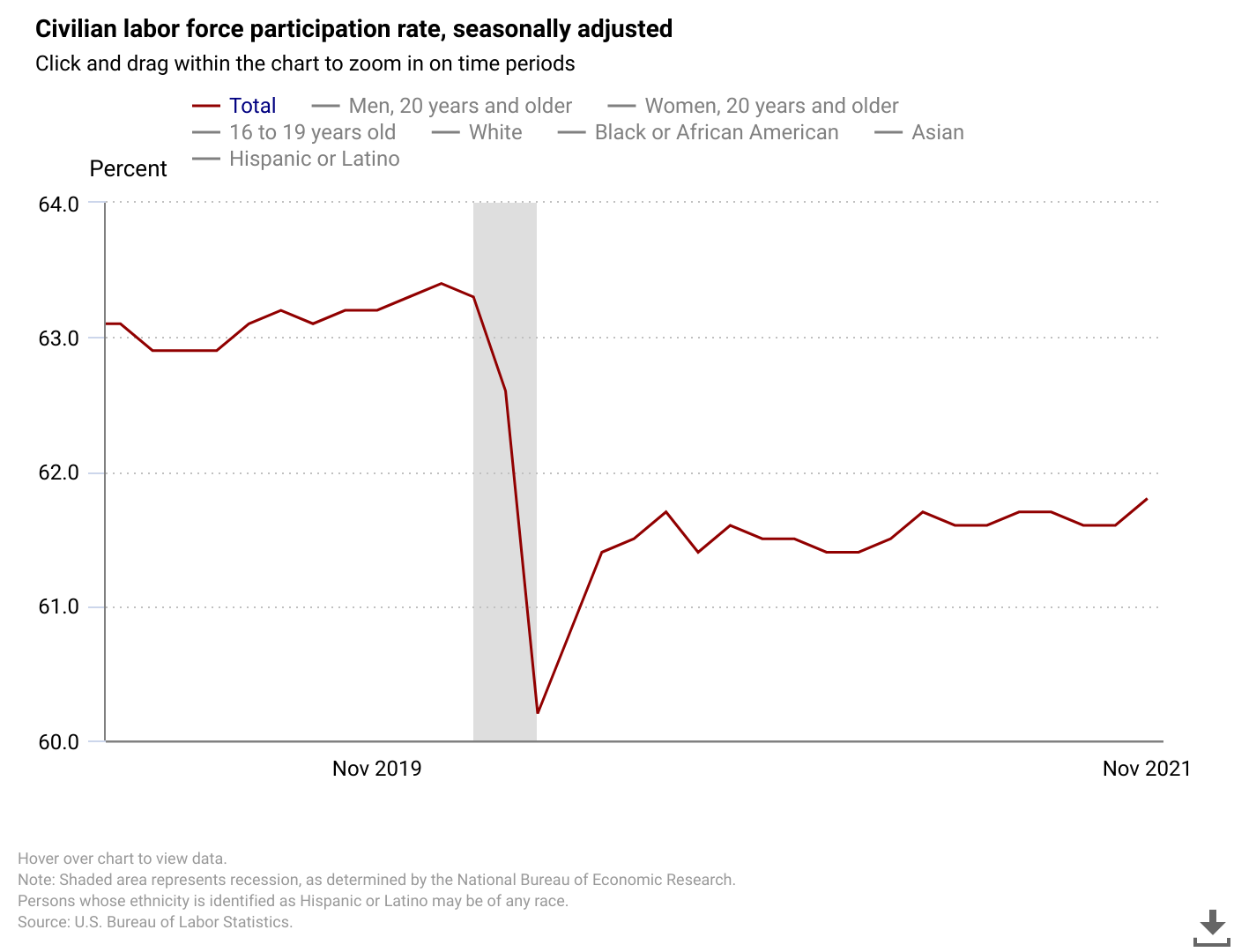 Not only has labor force participation not recovered from the original lockdowns in 2020, it has been largely unchanged since the summer of 2020.