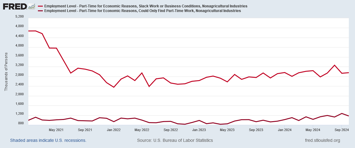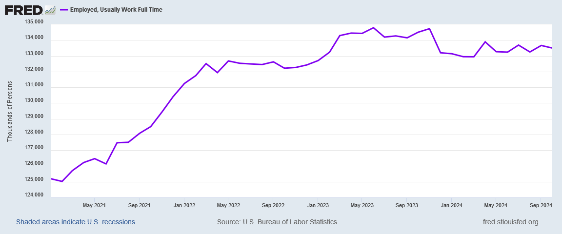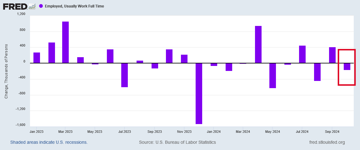 Still, loss of full time jobs is not unique to October, nor even to 2024. Full time employment in the US has been on the decline for a year.