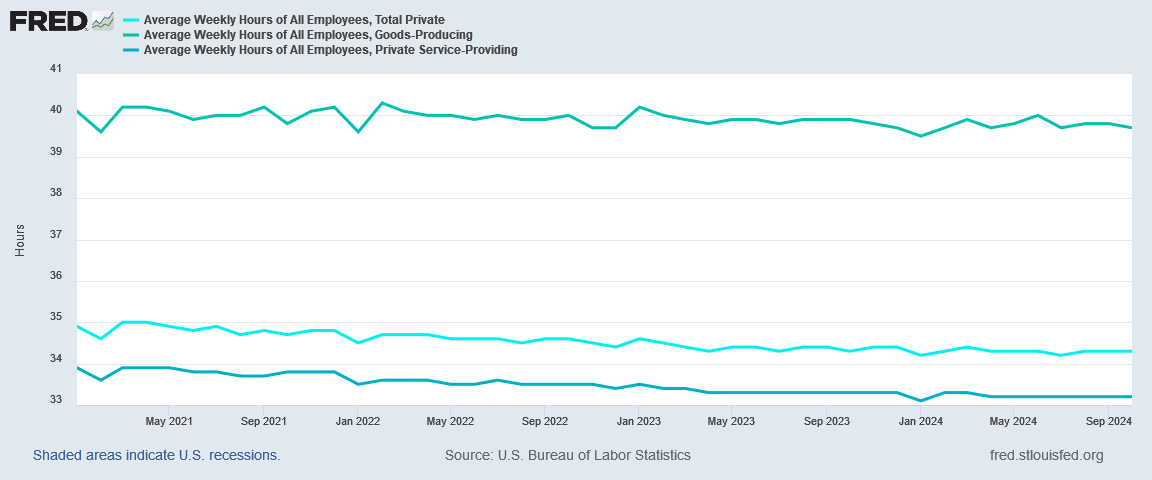 While across the whole of the private sector the average work week hours held at 34.3, that number is stlill a good half an hour less than it was at the start of the (Biden-)Harris Administration.