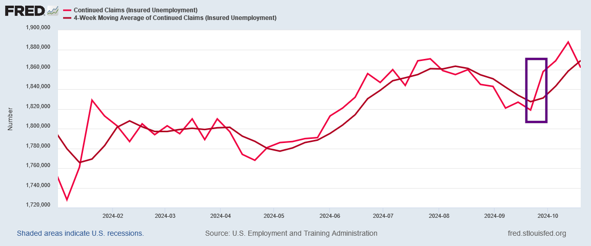 While Hurricanes Helene and Milton have undoubtedly scrambled employment in the southeastern United States, the most significant uptick in continuing claims for unemployment came in the last week of September—before the storms struck the United States.