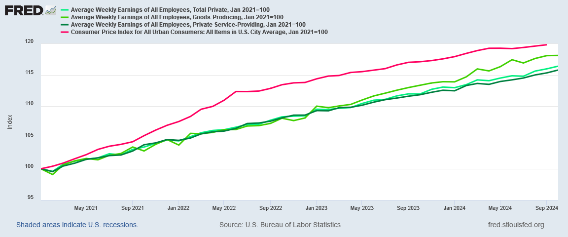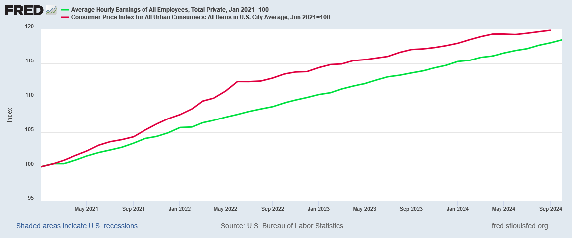 While an increase is always better than a decrease, if we index the hourly wage to January 2021 alongside the Consumer Price Index, we are reminded yet again that wages have NOT kept pace with inflation in this country.