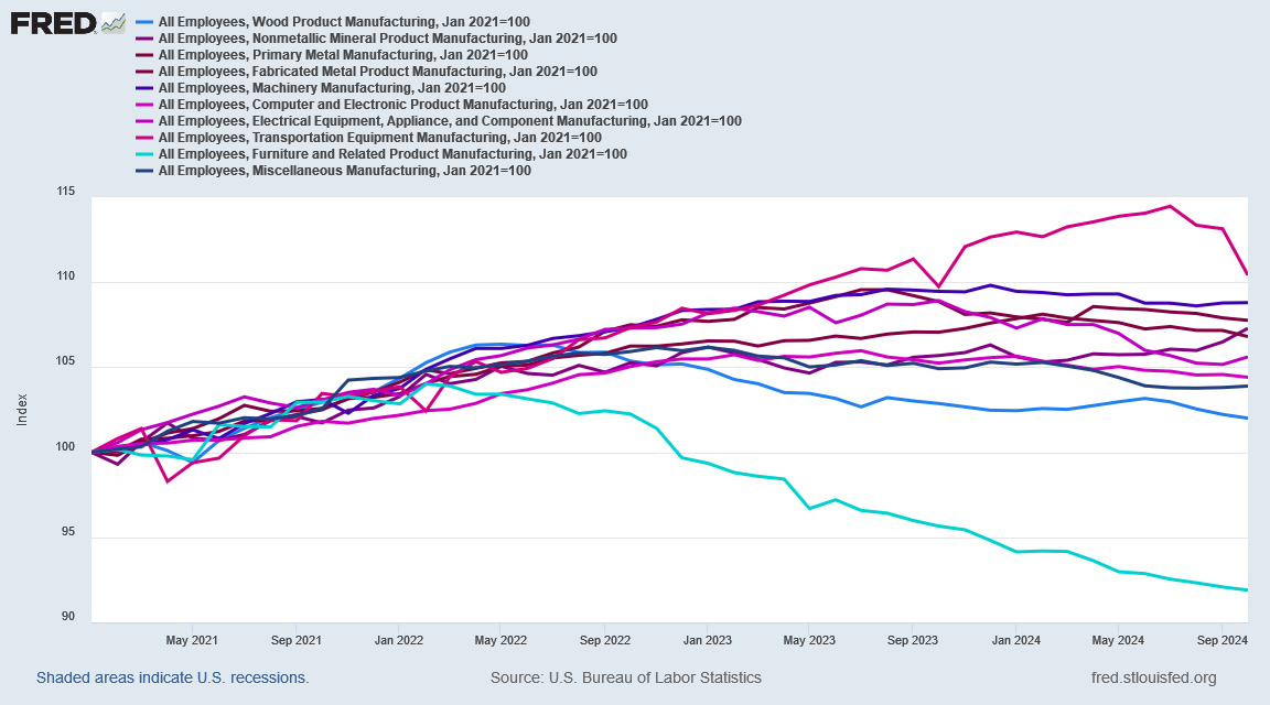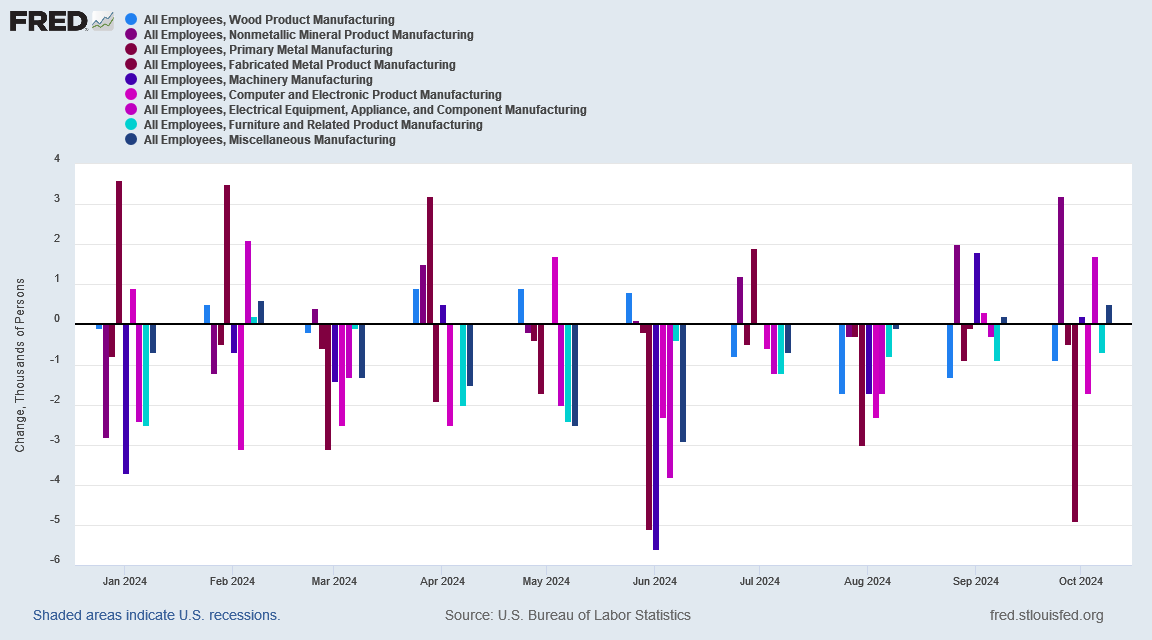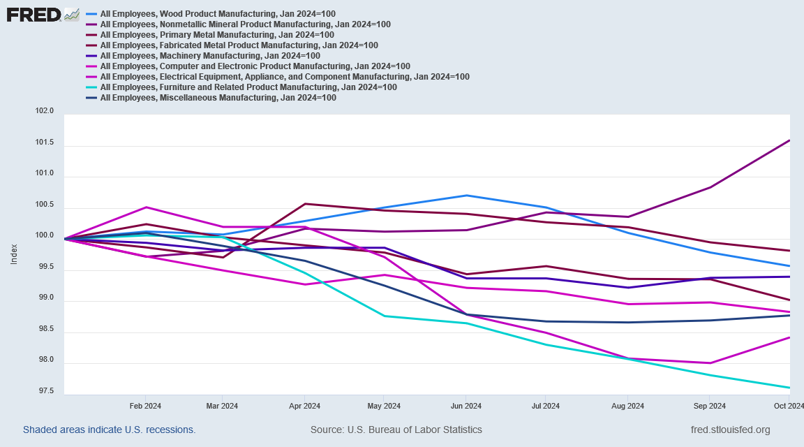 We have to remove the transportation sector to see just how bad 2024 has been for other manufacturing sectors, but when we do, we see that job loss is not something that just happened in October.