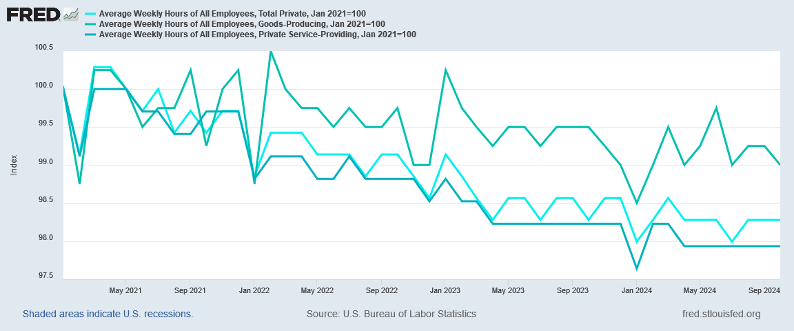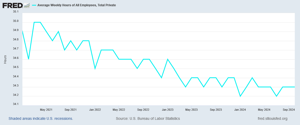 Even where there is employment, there is not always a lot of job to go with it. Specifically, throughout 2024 the average number of hours worked each week has been steadily on the decline.