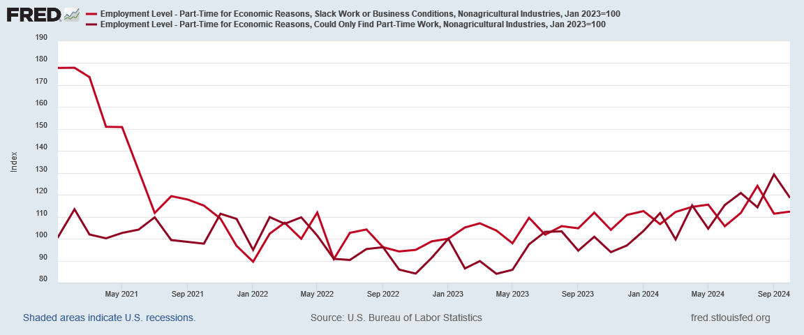 If we index the part-time employment metrics to January 2023, we see that part time employment due to economic constraints has been rising for the better part of two years.