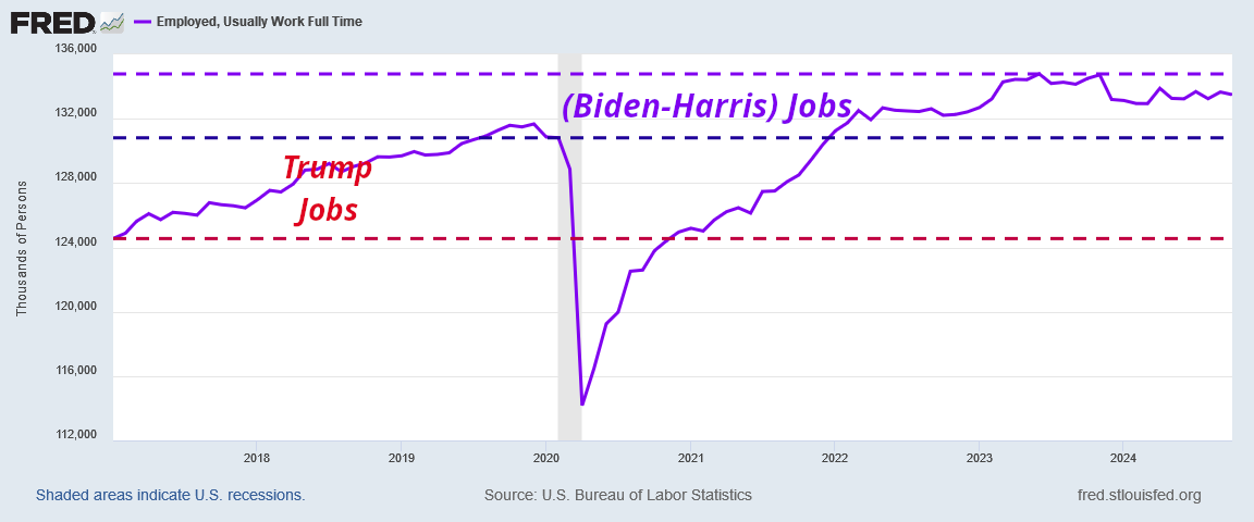 Of the approximately 3.9 million jobs beyond pre-COVID levels added during the (Biden-Harris) economy, since November of last year approximately 1.2 million (37%) of them have been lost, and we should pause to remember actual job growth under Kamala Harris has not been all that tremendous.