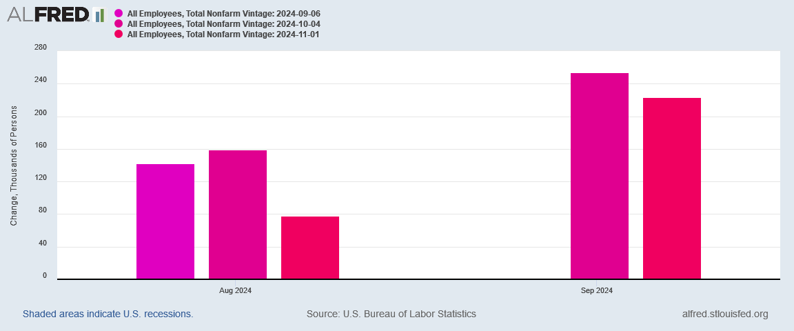 The August correction is especially ugly, as August had been revised up 17,000 jobs in September. Now on the October report the BLS is taking back that 17,000 jobs revision and then some.