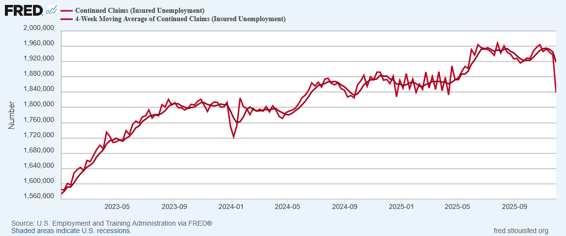 We should note also that initial claims underwent a similar plunge during Thanksgiving week as continued claims, only to rebound the very next week. The drop in continued claims may very well be an artifact of the Thanksgiving holiday resulting in an abbreviated reporting period on the week.