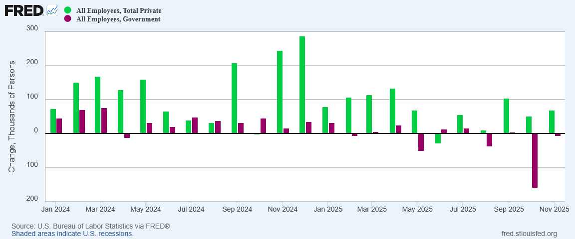 I will pause to make one note about October’s data. Although in the aggregate the BLS is reporting a net loss of nonfarm jobs in October of 108,000, that is entirely due to an extremely large reduction of 157,000 government jobs, coupled with modest private job growth of 52,000 jobs.