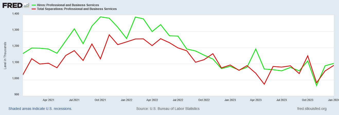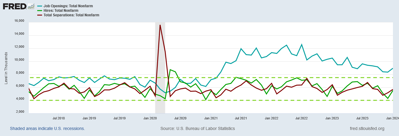 Whether the January Job Openings and Labor Turnover Summary represents good or bad news ultimately depends on which narrative you accept—or how far back you peel the data onion. However, even the top level seasonally adjusted numbers all went in the same direction—ever-so-slightly down.