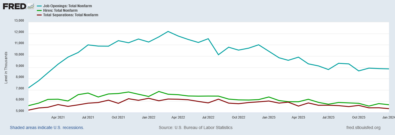 The number of job openings changed little at 8.9 million on the last business day of January, the U.S. Bureau of Labor Statistics reported today. Over the month, the number of hires and total separations were little changed at 5.7 million and 5.3 million, respectively. Within separations, quits (3.4 million) and layoffs and discharges (1.6 million) changed little. This release includes estimates of the number and rate of job openings, hires, and separations for the total nonfarm sector, by industry, and by establishment size class. This release also includes 2023 annual estimates for job openings, hires, and separations.
