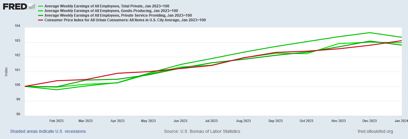 In an healthy labor market, these constraints would be marked by real income growth within the workforce. Yet when we index both Average Weekly Earnings and the Consumer Price Index to January of 2023, we see problematic real income growth at best, and a decline in real incomes at the end of 2023.