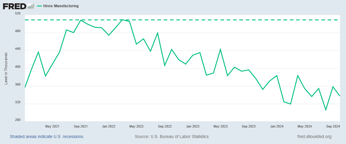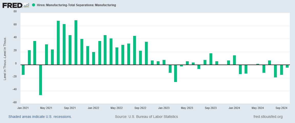 Nor can we say that it is simply a question of hiring slowing in various sectors. When we look at the net hiring (Hires less Total Separations) for manufacturing since 2021, we see that manufacturing has had multiple months especially in 2023 and 2024 where the net hiring was negative—i.e., there was job loss in manufacturing.