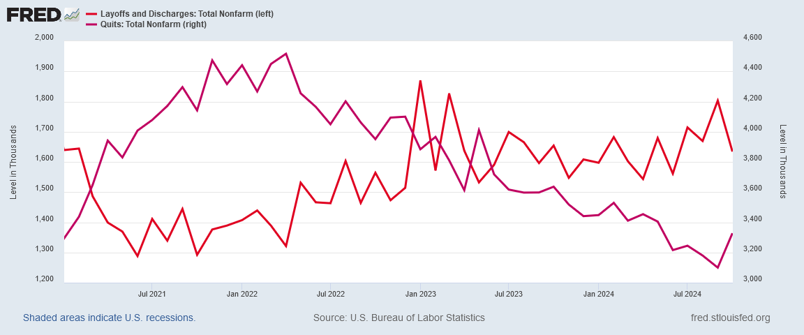 What is perhaps even more disconcerting, however, is that the number of Quits—those individuals who voluntarily leave their jobs for whatever reason—has been on the decline but the number of layoffs has been trending up.