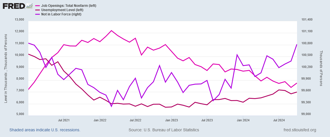 As the number of reported job openings has declined, the ranks of the unemployed have risen and the number of individuals not in the labor force has risen. There are few ways to interpret such a signal as anything other than there are simply fewer and fewer job opportunities for individuals.