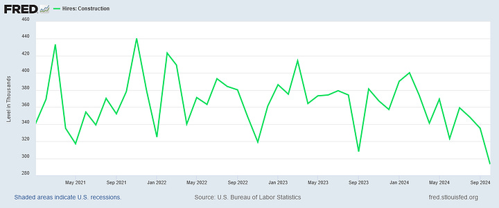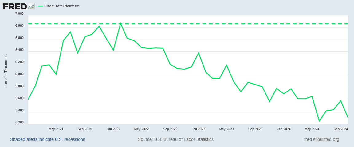 As we have seen nearly every month for quite some time, if we focus on the hiring numbers—those job openings which actually got filled—we see that the downward trend in hiring has not abated since it began in February of 2022.