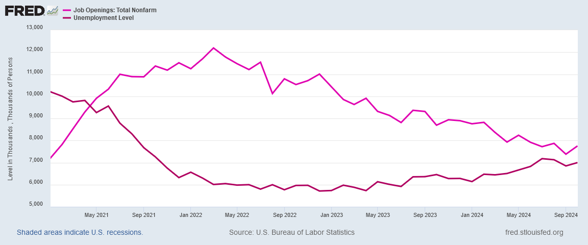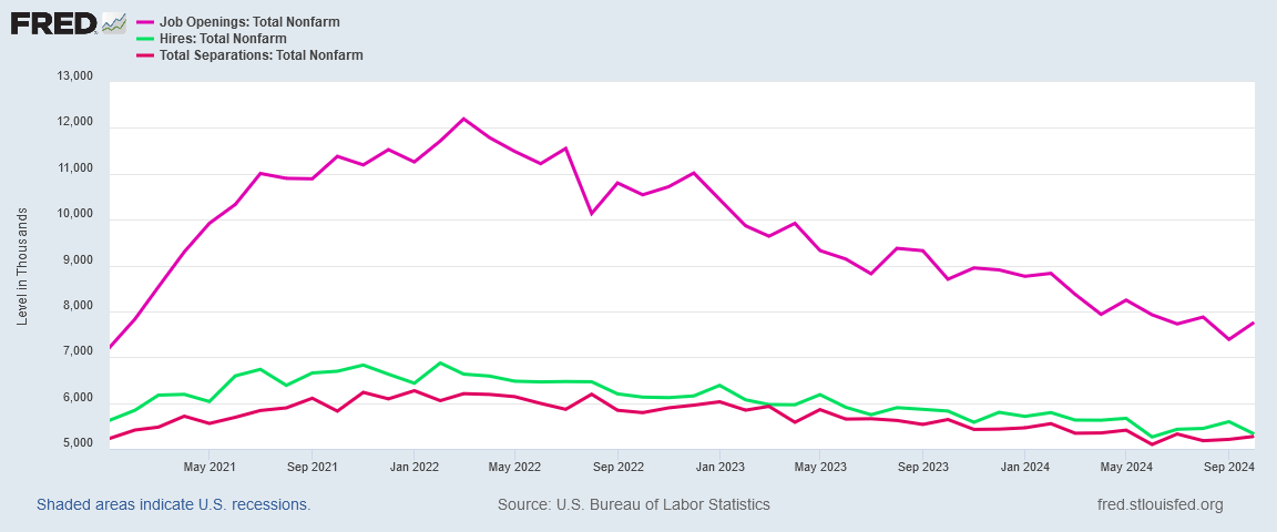 The number of presumed job openings in this country peaked in early 2022, and has trended down ever since. The increase in October was not at all large enough to break out of that that trend, suggesting that the decline is continuing.
