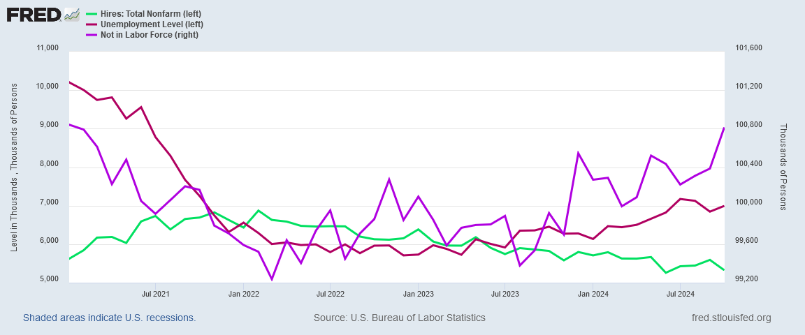 Nor can we simply ascribe this pattern to being an artifact of exaggerated job openings data. If we make the comparison using the hiring data instead, we see the same correlation: hiring has declined as unemployment has risen, and as the number of workers not in the labor force has risen.