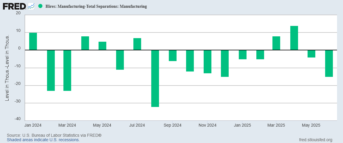 As the June JOLTS data was not good, we have to anticipate the likelihood that July will not be any better, and could be worse, particularly for manufacturing. That likelihood is all too real, unfortunately.