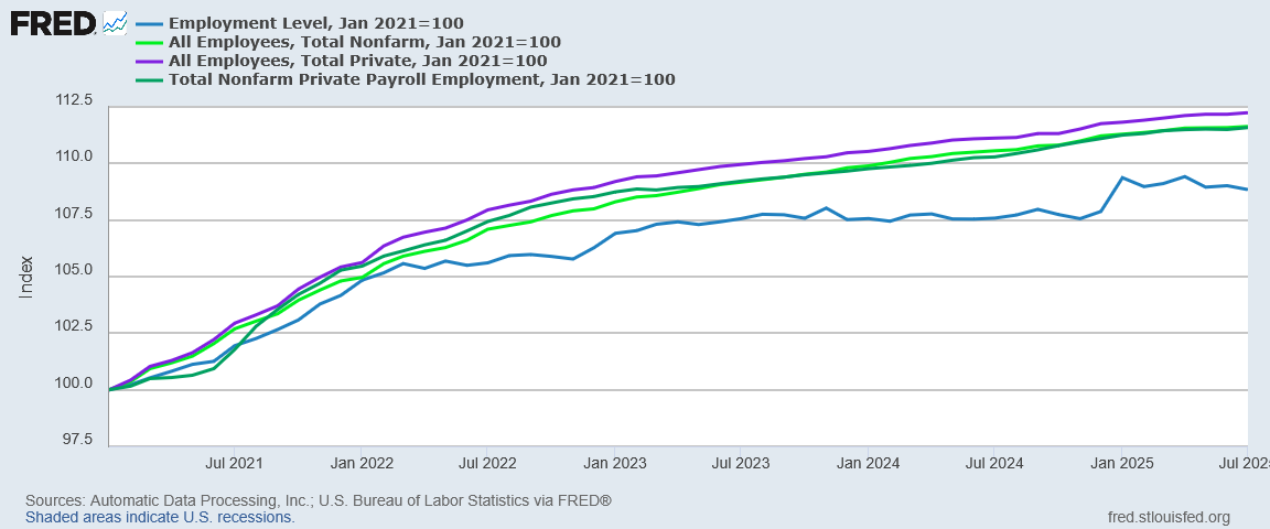 The Employment Level flat-lined in 2022 and again between 2023 and 2024, while the Establishment Survey metrics did not. Indexed against January 2021 data, the Employment Level flat-lined again in 2025.