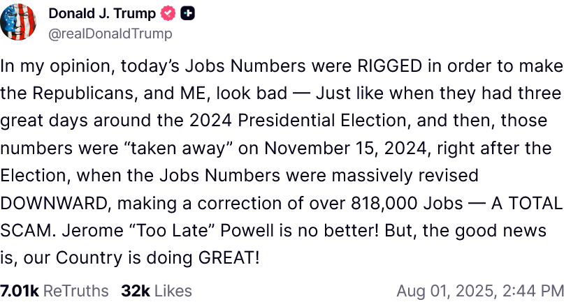 If President Trump is right, Dr. McEntarfer and the entire Bureau of Labor Statistics have done irreparable harm to themselves and their work. Speaking as an analyst who uses BLS data frequently, to say this is a big deal is an understatement.