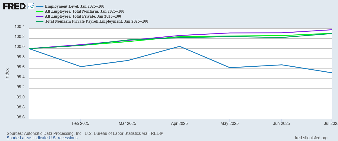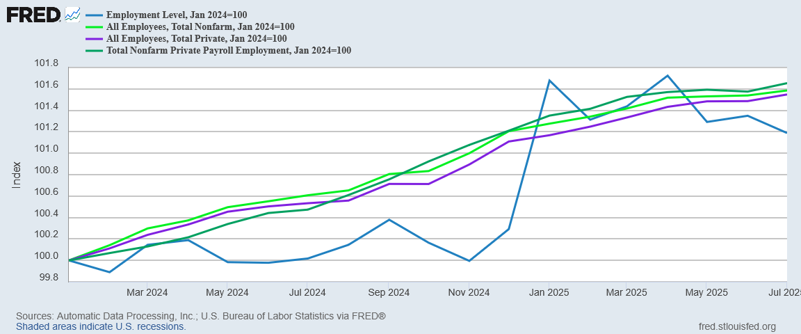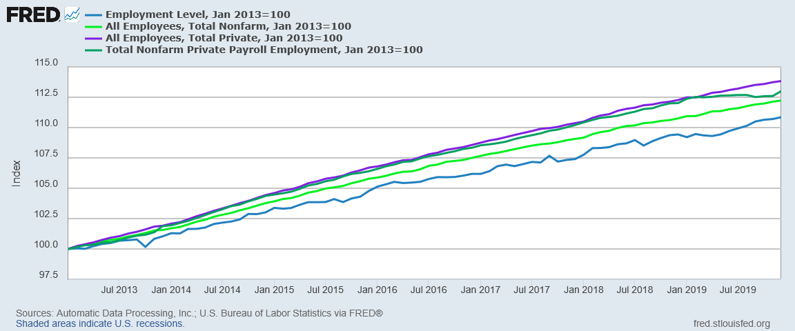 The second and third are the indexed versions of the Employers’ Survey headcount of working employees, the ADP National Employment Report, and the Household Survey from report.