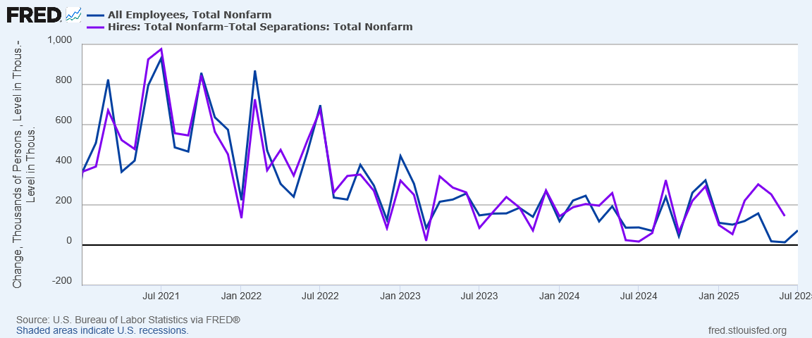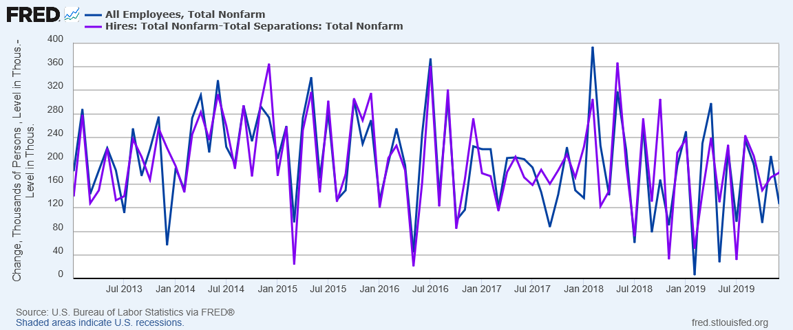 The JOLTS metrics are another perspective on the same employment information. We should expect that the net hiring captured by the JOLTS reports should align fairly closely with the change in the All Employees metric from the Establishment Survey. Pre-COVID, that is what happened.