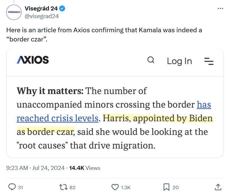 Was Harris actually “border czar”? At the time, the media certainly talked about her as if she were. Axios even used the term in announcing her trip to Guatamala and Central America in April, 2021.