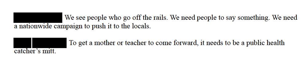The very next speaker proposed another solution: reclassify “concerning” behavior into the “public health catcher’s mitt” so that “mother[s] and teacher[s]” feel comfortable coming forward.
