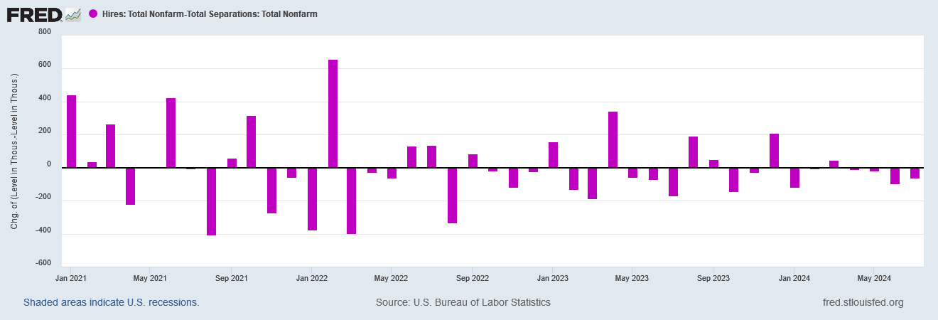 Looked at another way, between hires and separations in most months of the (Biden-)Harris Administration, the change in net hiring has been negative.