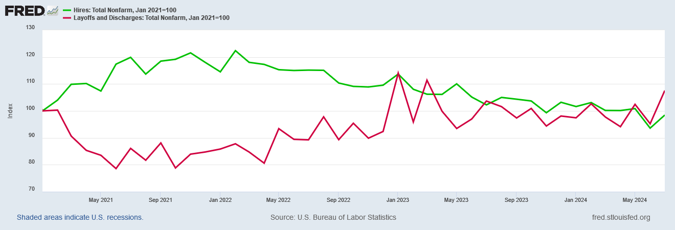 Rising layoffs mean business are getting rid of workers. Declining hires mean those workers are not being replaced. That is not a sign of a healthy labor market.