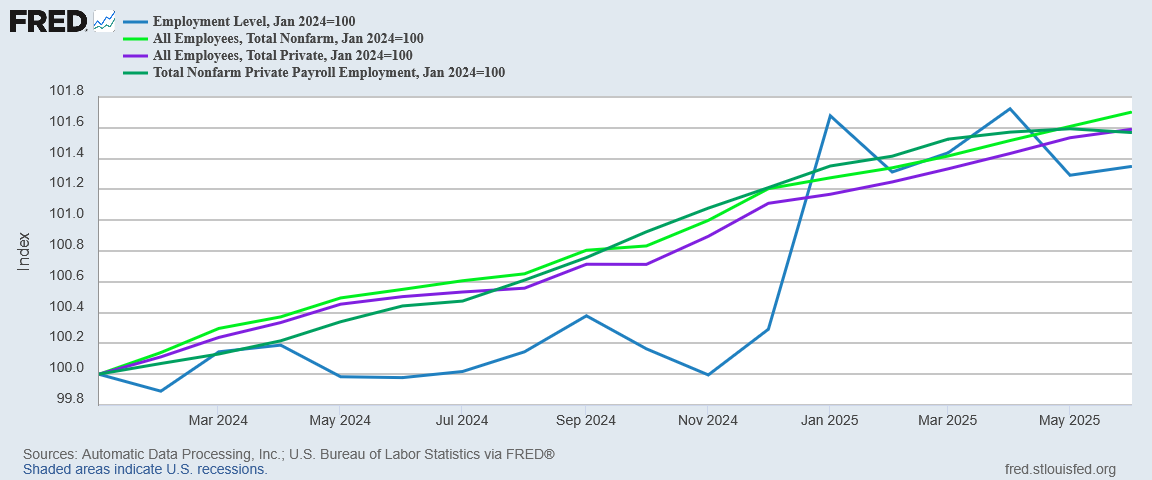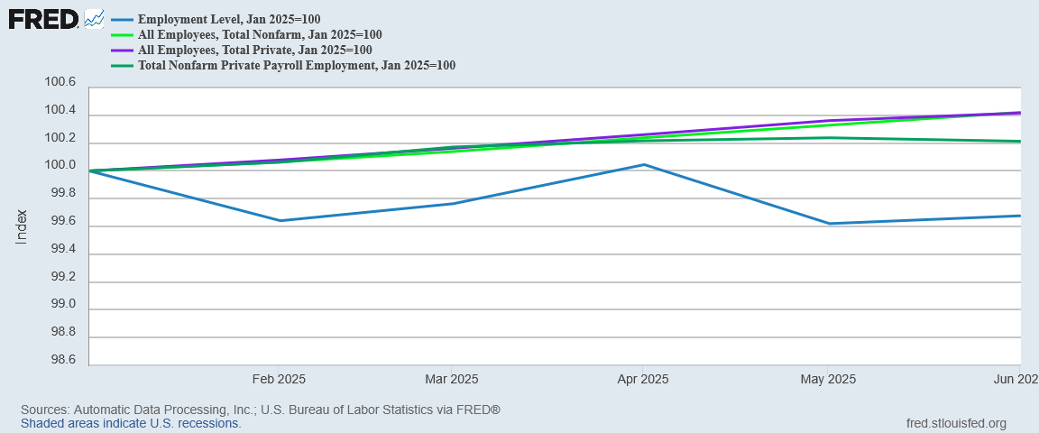 With six months of data for 2025, we begin to have enough post-Biden data to focus on the BLS results strictly for the Trump era—and that does not add any confidence to the BLS data. Redoing the index to January of 2025 confirms Lou Costello Labor math, highlighting the divergence between the Employment Level metric from the BLS Household Survey and the metrics of the BLS Establishment Survey.