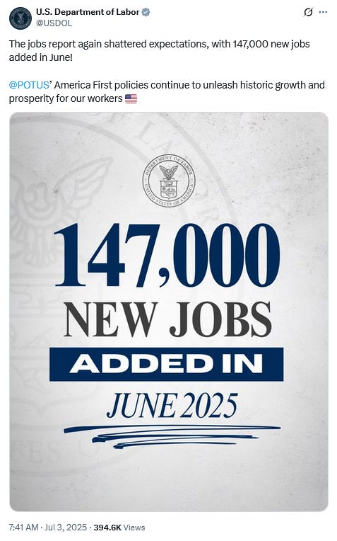Given the 33,000 jobs lost on the ADP jobs report, for the BLS to report 147,000 new jobs in the US for June is a bit of news almost too good to be true.