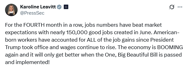 White House Press Secretary Karoline Leavitt naturally took a victory lap over the numbers, crowing about the report on X.